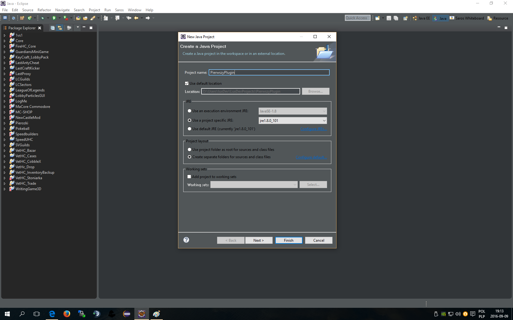 Następnie kliknijmy Java Project, i wpiszmy w pierwszym oknie nazwę projektu np. PierwszyPlugin następnie kliknijmy Finish.