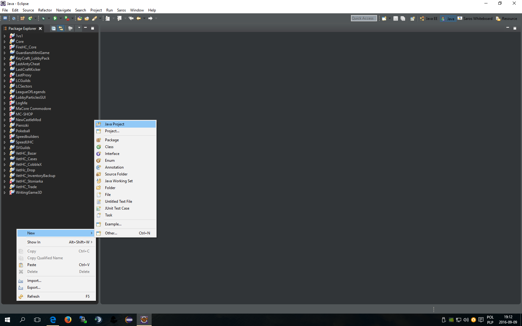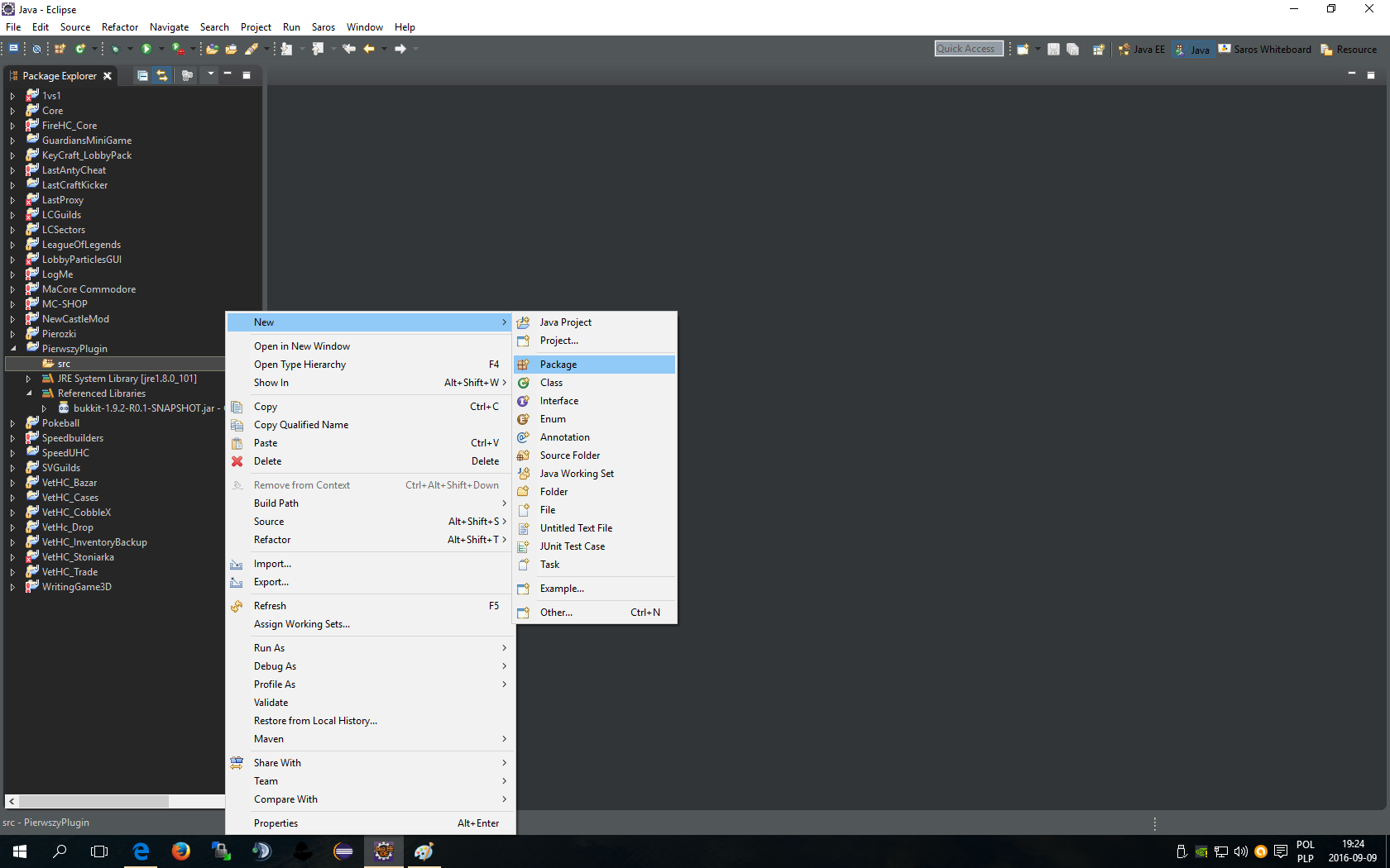 W tym poradniku zajmiemy się główną klasą, i uruchomieniem pluginu, na początku otwórzmy eclipse i po lewo kliknijmy prawym przyciskiem myszy aby stworzyć nowy projekt.