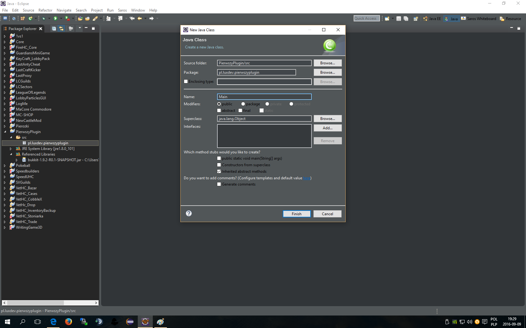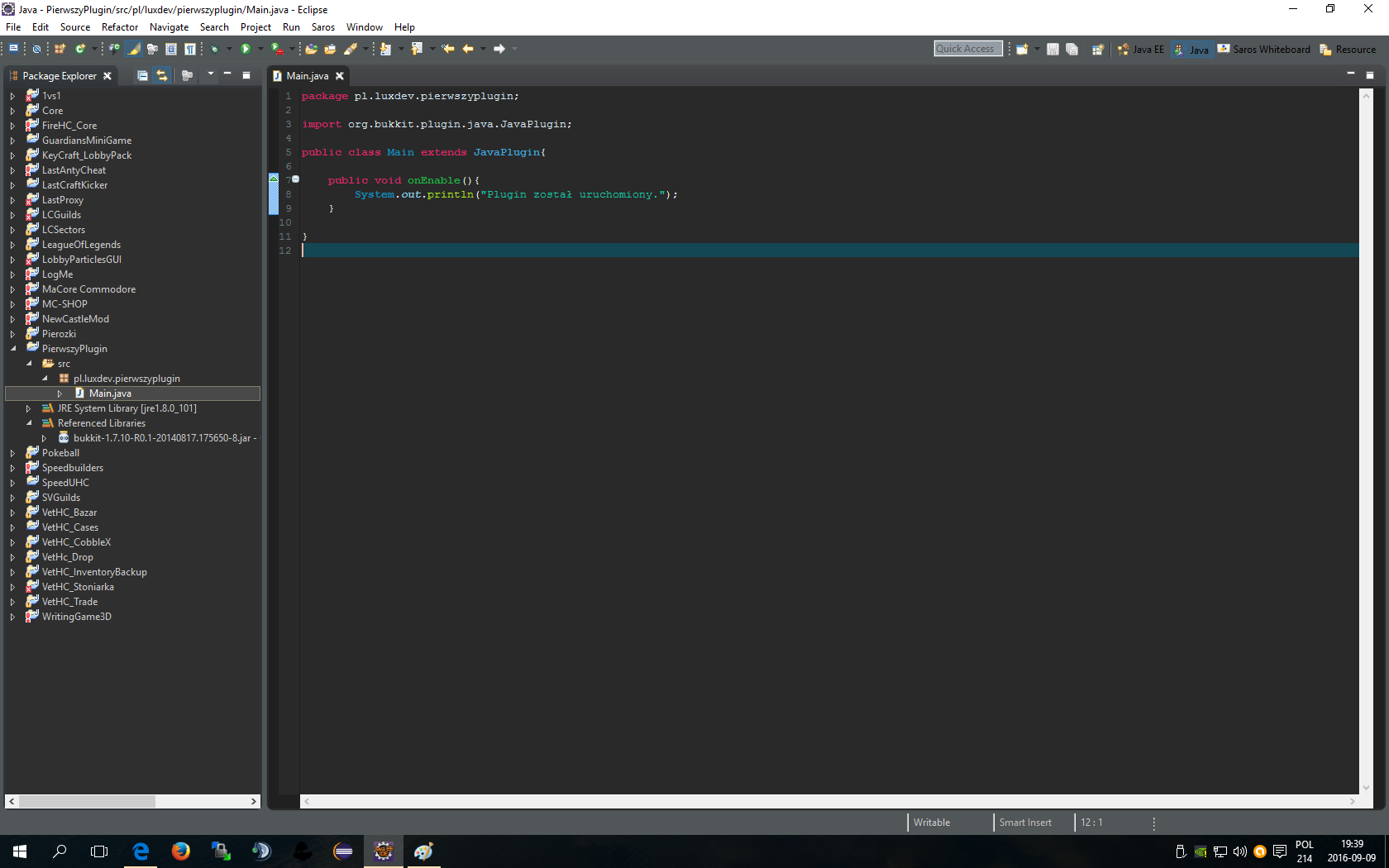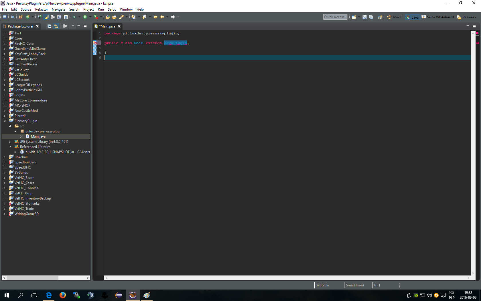 Następnym krokiem będzie otwarcie klasy, oraz zaimportowanie JavaPlugin, a więc otwórzmy klasę i dopiszmy extends JavaPlugin