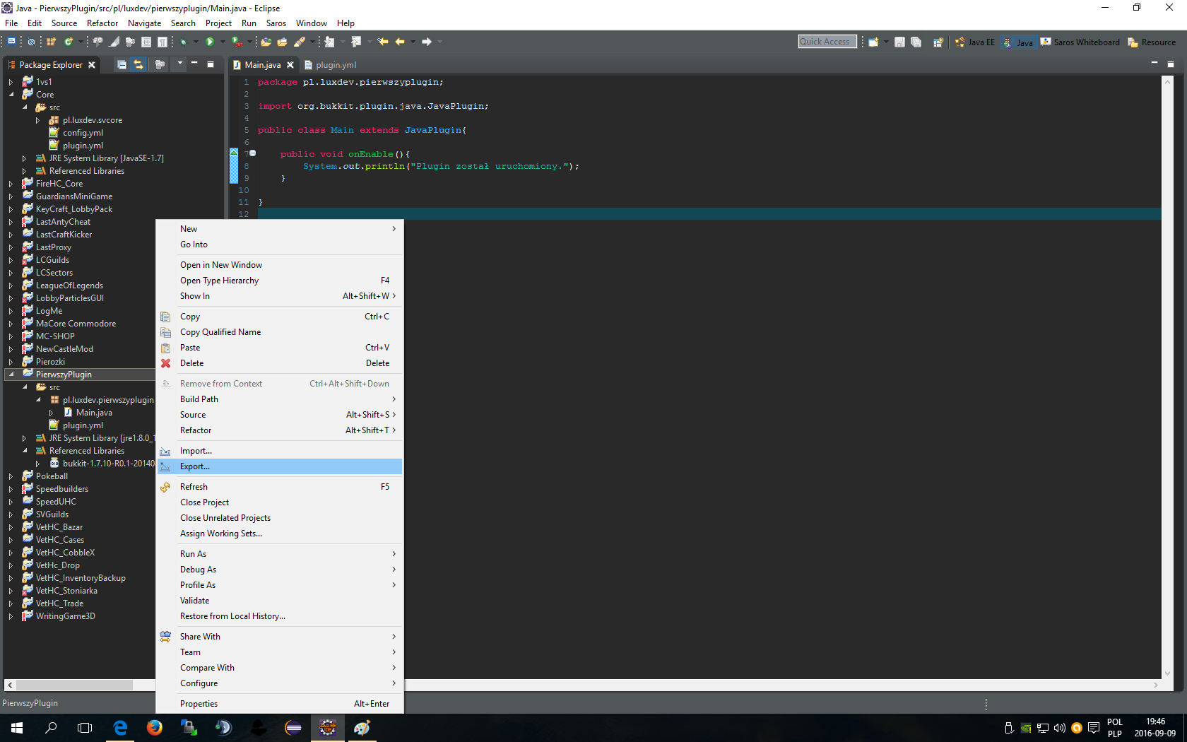Cześć, zrobiłem to samo co ty na poradniku, tylko na wersji eclipse 1.14.0.1 orax na wersji minecraft craftbukkit 1.8, weksportowałem mój plugin na server, ale server go nie widzi, wiesz może co robie nie tak albo masz dla mnie jakąś rade. Prosiłbym o pomoc. Z góry dziękuje