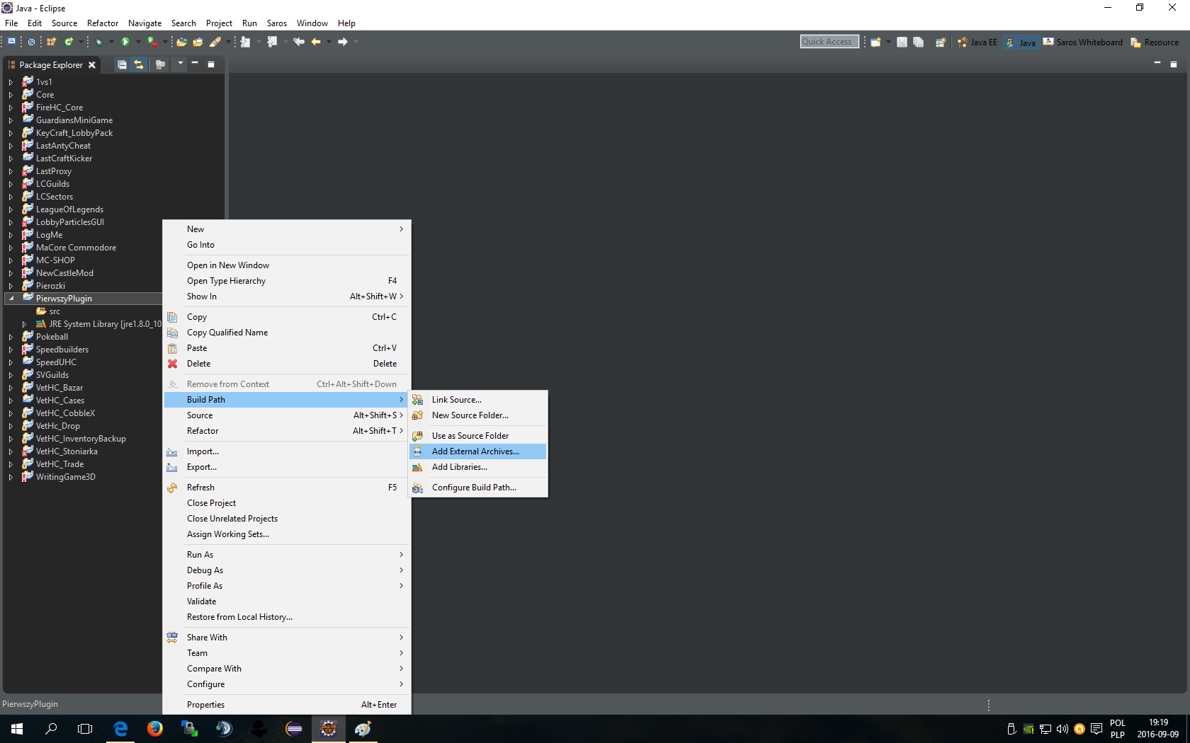 Gdy utworzy się nam pierwszy projekt otwórzmy go, następnie kliknijmy prawym na niego, oraz kliknijmy Build Path, Add External Archives.