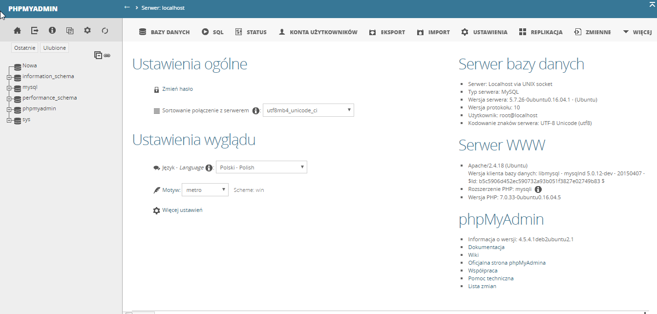 Teraz sprawdzamy czy działa nam phpmyadmin oraz logujemy się użytkownikiem root i wcześniej podanym hasłem