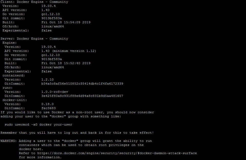 Po jakimś czasie wypluje nam info o zainstalowanej wersji dockera.