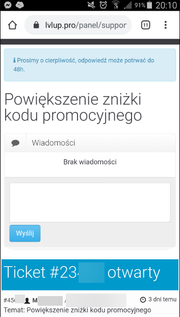 Zwracam się do Administracji LVLUP, gdyż 3 dni temu utworzyłem ticket i do tej pory nie otrzymałem odpowiedzi ( Nie. Nie zamykałem Ticketu )