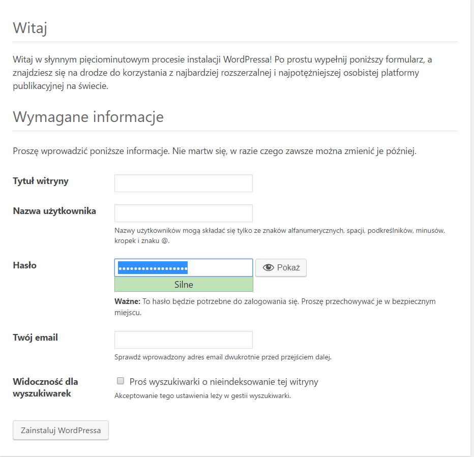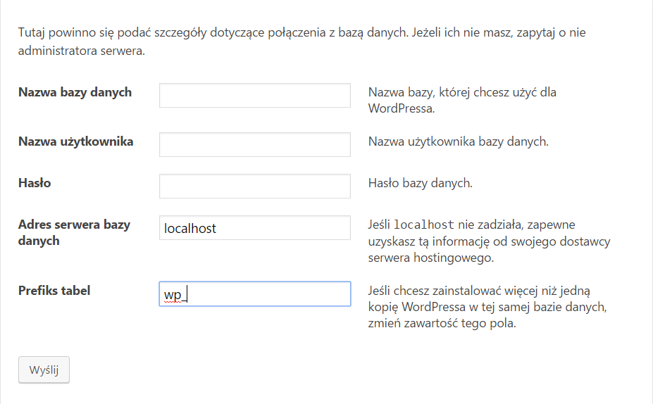 Po utworzeniu bazy danych przejdź na adres, na którym jest już gotowy do instalacji WordPress: