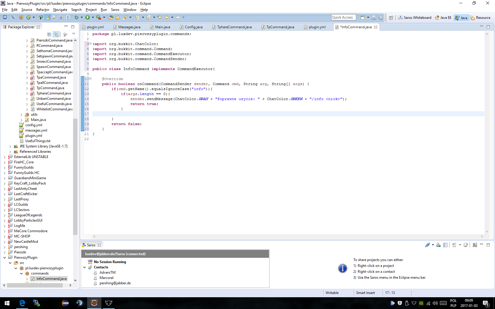 teraz dodajmy tam co ma się wykonywać po wpisaniu komendy /info oraz sprawdźmy czy posiada ona wymagany argument 0 (czyli nick [w javie zaczynamy liczyć od 0 jako 1]), jeśli nie ma wyświetlimy poprawne użycie tej komendy.