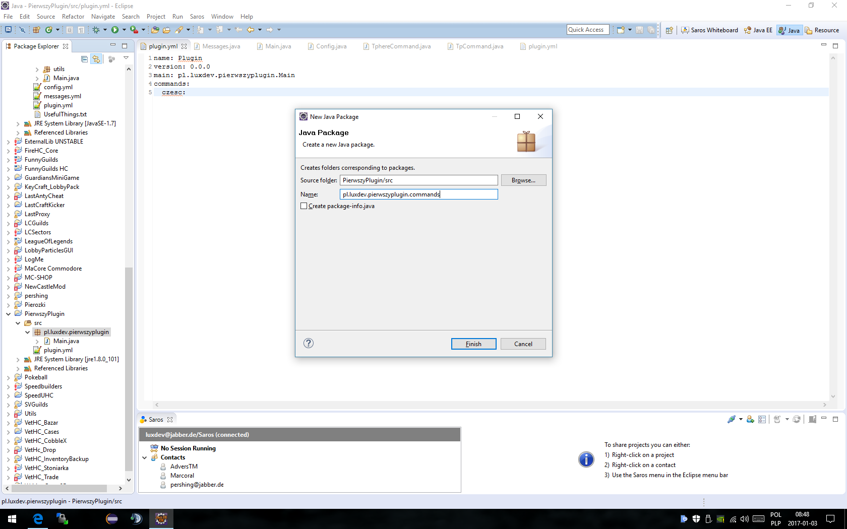 Zacznijmy od stworzenia nowej paczki klikając na naszą główną paczkę -> new -> Package nazwijmy ją commands, ja tworzę paczki od głównej aby fajnie się układały w kompilatorze powinno to wygladać w ten sposób, na samym końcu dodajemy kropkę i nazwę - .commands