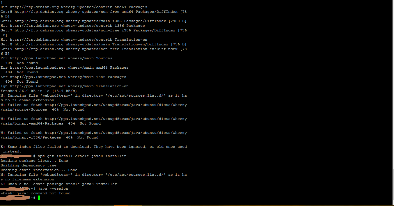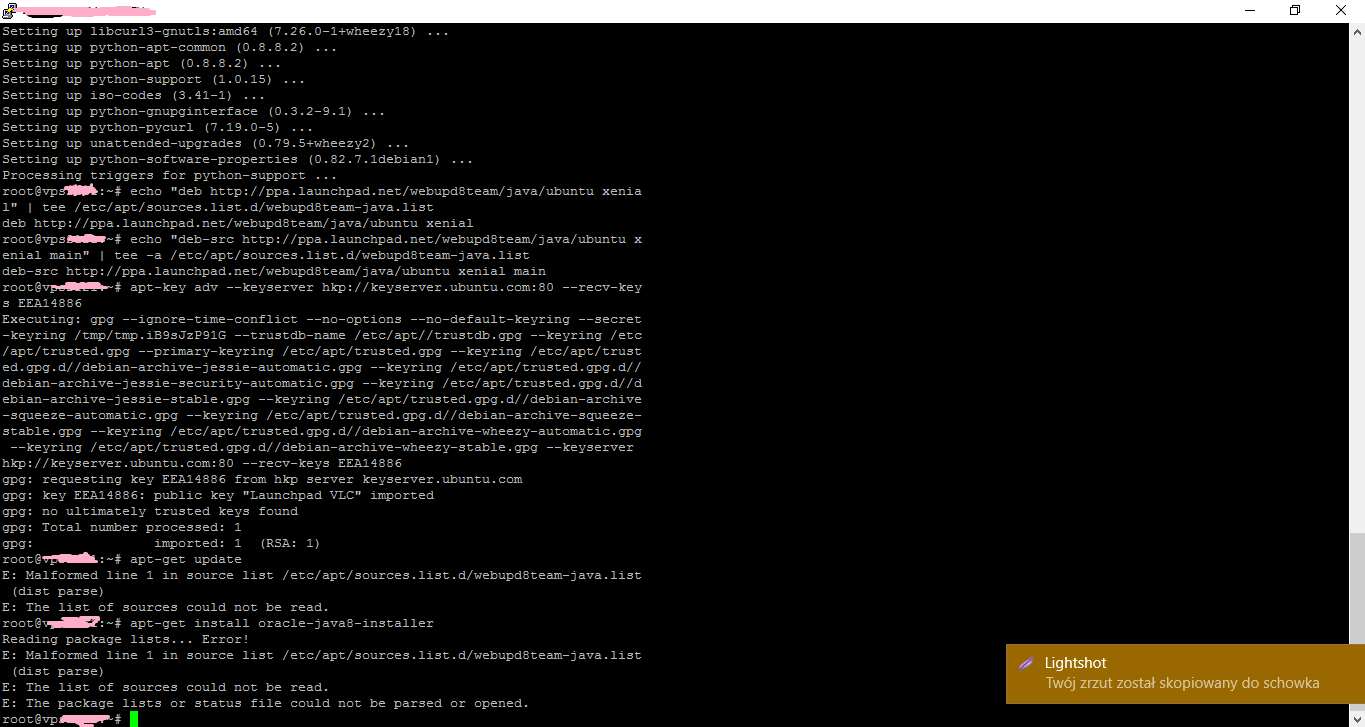 Wszystkie komendy działają oprócz apt-get install oracle-java8-installer.