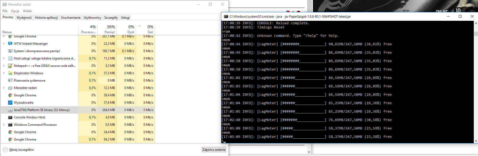 Jak można zauważyć w grze za pomocą pluginu LagMeter otrzymujemy wynik 58,37MB/247,50MB a menedżer zadań (proces serwera jest zaznaczony) pobrał sobie 284,9MB.