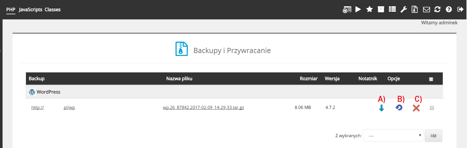 A) Pobierz - Ściąganie kopii zapasowej na dysk. Co jakiś czas warto pobrać taką kopię zapasową i wrzucić gdzieś na dysk, gdyby nastąpiła jakaś awaria - zawsze jesteś zabezpieczony.