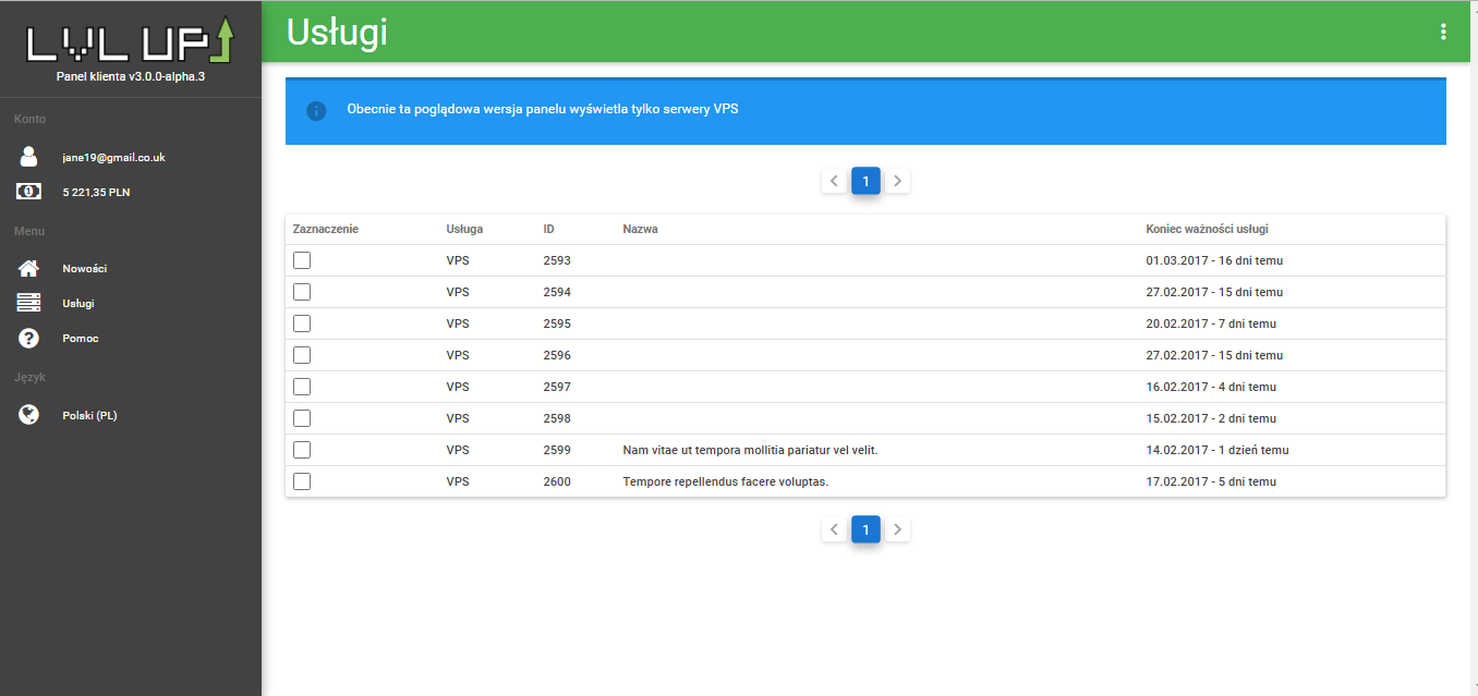 Względem panelu v2 faktycznie pozycji w menu po lewej jest dużo mniej jednak funkcjonalność nadal jest ta sama. Chcę maksymalnie uprościć obsługę i zamiast obecnych osobnych zakładek do usług, będzie po prostu jedna lista ze wszystkimi usługami.