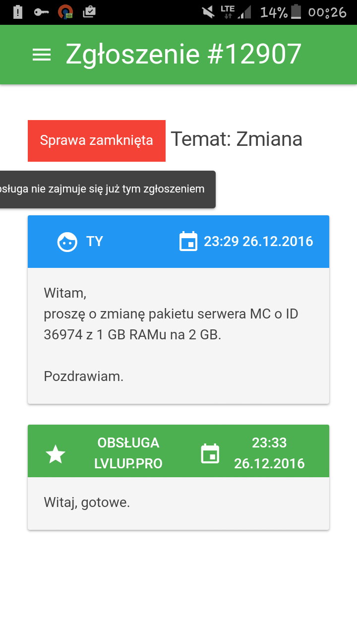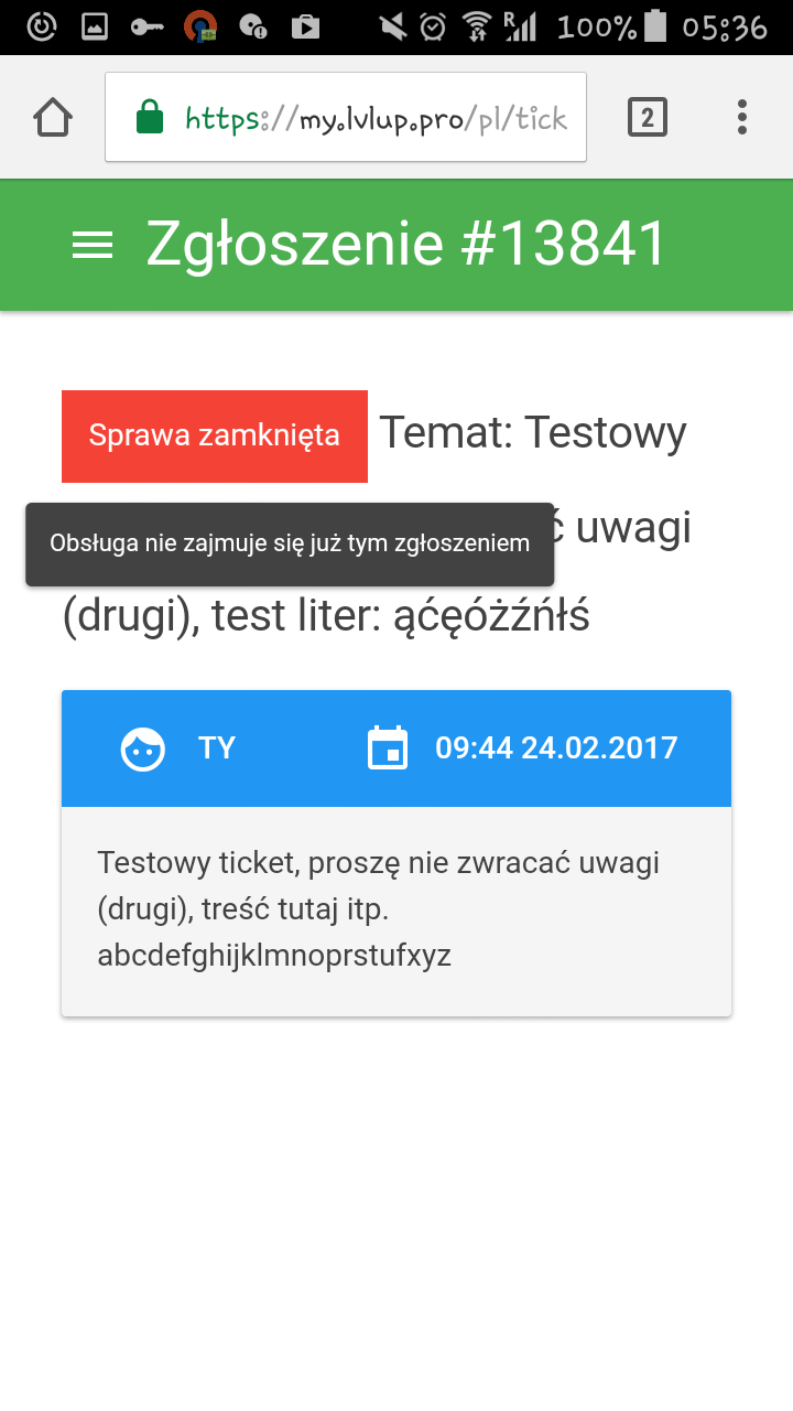 Komunikat o stanie ticketa (ten szary popup) jest… za duży i ucina go.