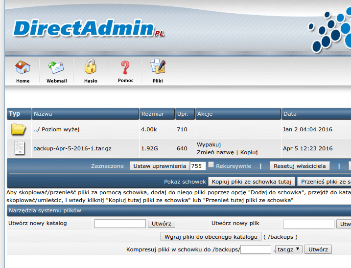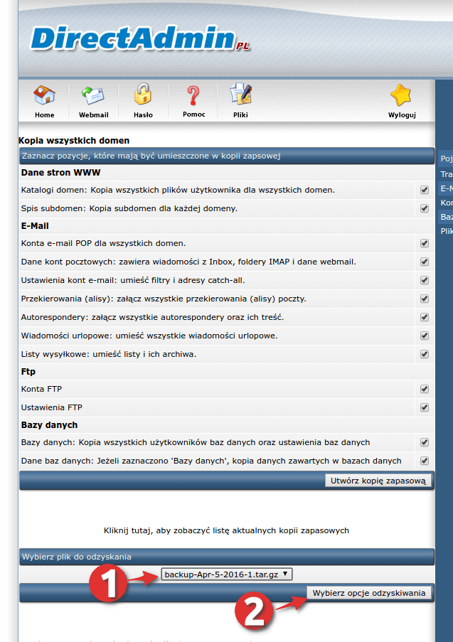 Tym razem na dole znajdziemy listę swoich kopii, wybieramy jedną z nich i przywracamy, może to chwile potrwać, nie zamykamy strony dopóki DirectAdmin nie przywróci kopii.