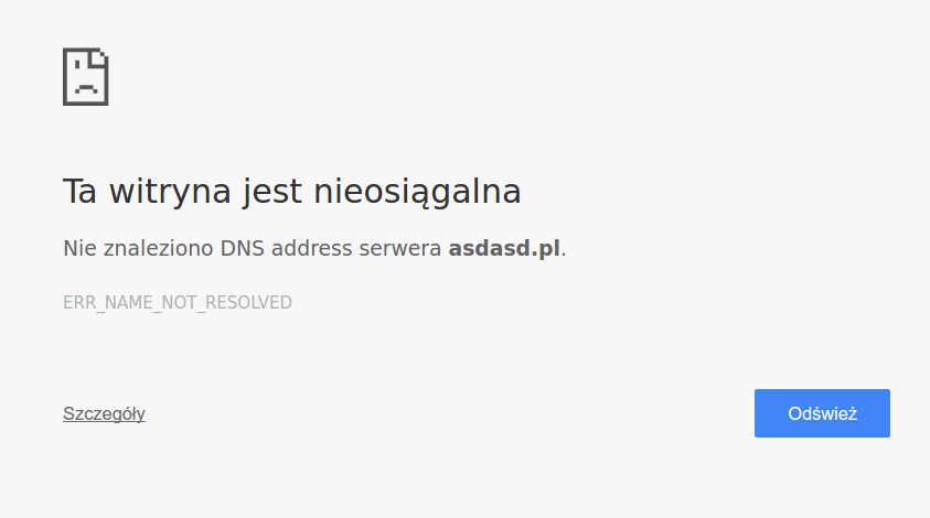 Jeśli jesteś świeży w temacie hostingu WWW oraz przy zakupie wpisałeś dowolną nazwę w domenie .pl to zapewne może Cię zdziwić taki błąd “Nie znaleziono DNS address serwera” lub podobny przy wchodzeniu na stronę: