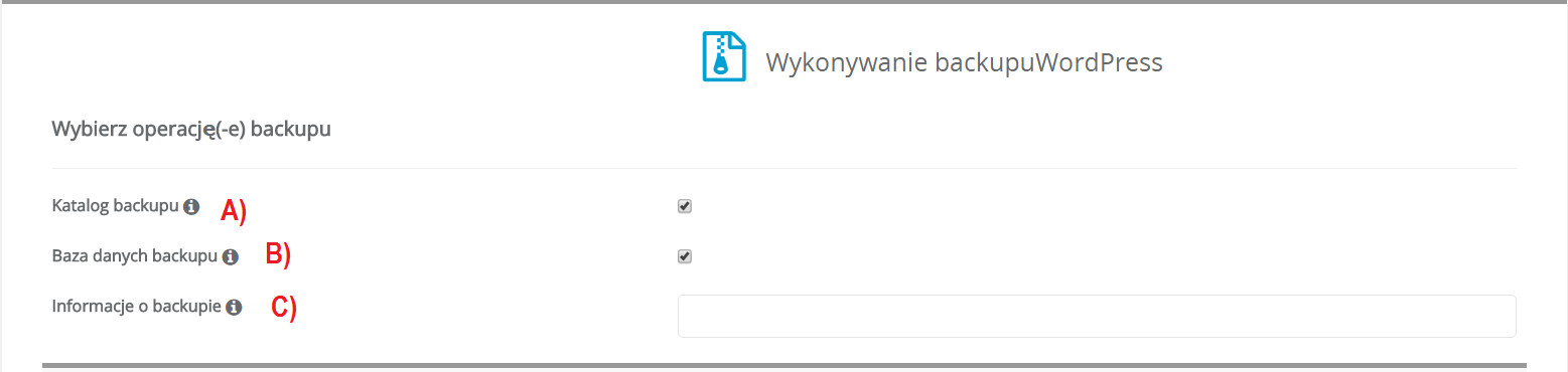 Gdy jesteś w sekcji Wykonywanie backupu musisz sprecyzować, co chcesz otrzymać w kopii zapasowej.