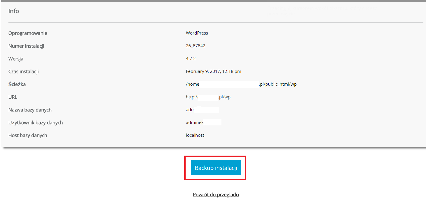 Kliknij przycisk Backup Instalacji aby kopia została zapisana.