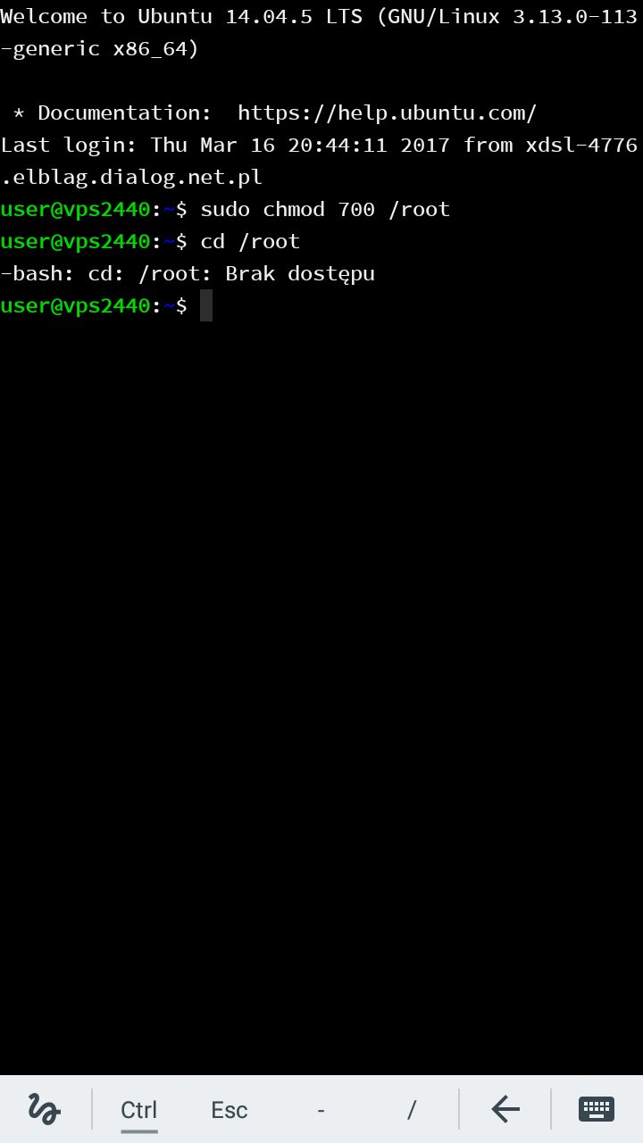 Co do folderu root możesz zastosować tą komendę: chmod 700 /root - tą komendę użyj na koncie root’a. Wtedy zwykły użytkownik nie wejdzie do folderu i zostanie wyrzucony komunikatem ;)