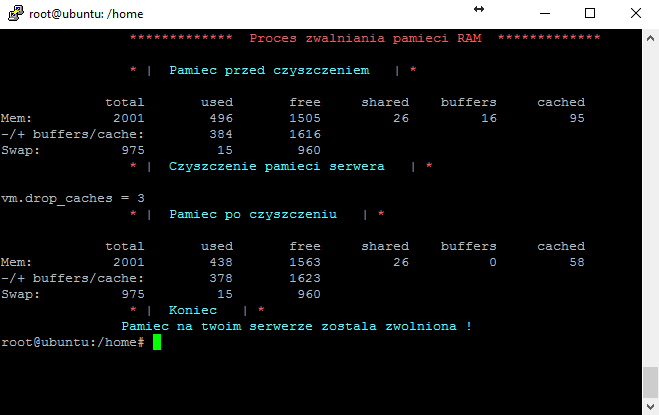 W załączniku dodaję wam plik dzięki któremu zwolnicie troszkę pamięci ram :D Dlaczego napisałem coś takiego ? Miesiąc po zakupie serwer z oferty VPS KVM niestety ale pamięć ram była prawie zapełniona w 90 % co nie dawało mi spokoju ! Po użyciu tych komend które posiada ten plik. pamięć jest wykorzystywana w ok. 30 % :smiley: Komenda ta zwalnia na naszym serwerze cache.