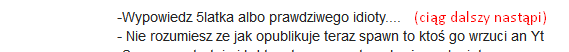 -Wypowiedz 5latka albo prawdziwego idioty....- Nie rozumiesz ze jak opublikuje teraz spawn to ktoś go wrzuci an Yt-Serwer wystartuje i bd tam ten spawn to oskarżą o plagiat....