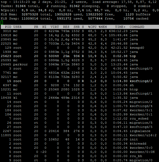 vm.swappiness mam już ustawione na 1. Z tego co popatrzałem miałem przydzielony ram w plikach start.sh który przekraczał 32GB. A jak wiodomo java lubi sobie alokować pamięć. Myślę że to mogłobyć problemem?