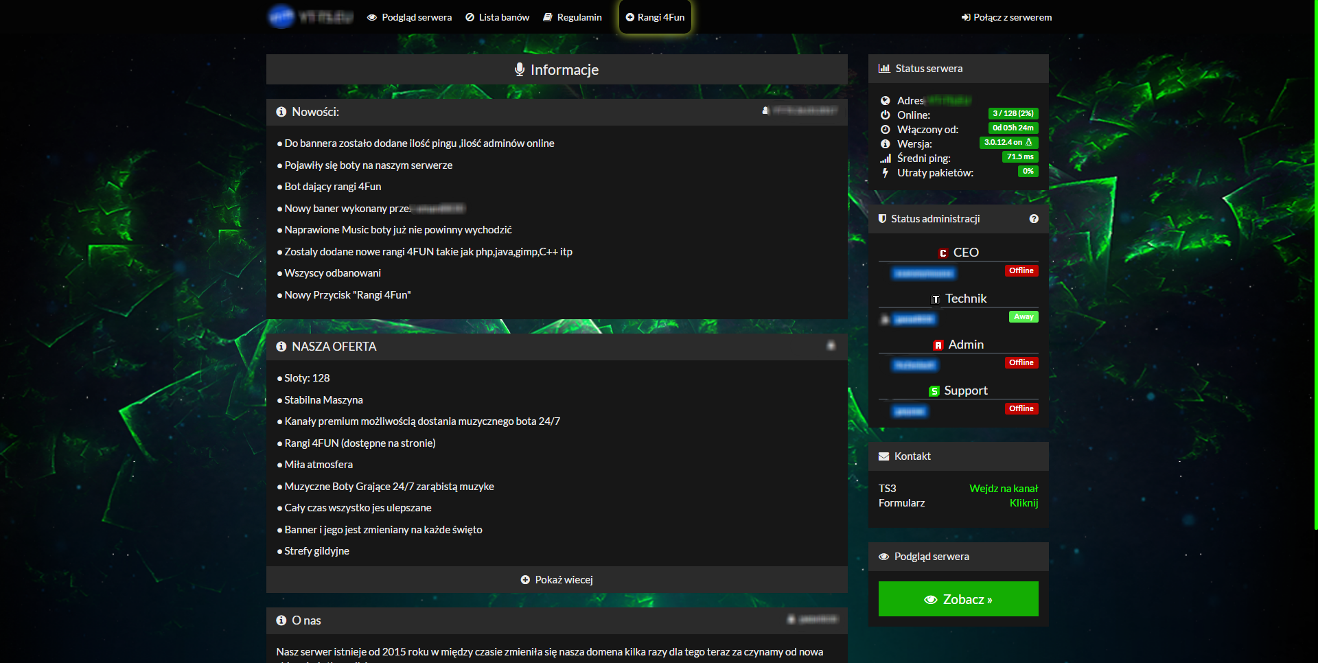 Cześć zauważyłem na niektórych stronach które prowadzą ts3 np http://ts24h.pl lub http://yt-ts3.eu nie chce reklamować za bardzo takie coś że samo zmienia ile jest osób na ts3 czy ping jaka wersja i jaki admin jest online na kilku stronach jest to dokładnie tak samo zrobione w tych samych miejscach tylko wygląd się zmienia np. z czarnego na zielony i kilka animacji ale to tam naj mniej ważne i teraz nie wiem czy to jest jakaś gotowa strona i coś się zmienia lub jakis skrypt gotowy czy to samemu właściciele pisali?