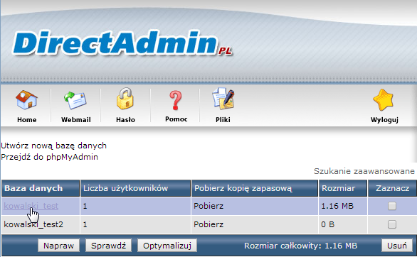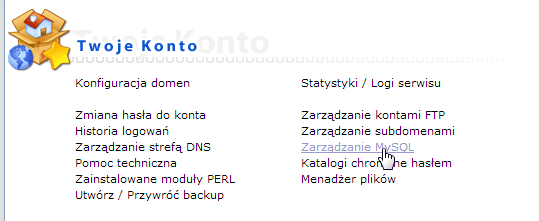 Logujemy się do panelu DirectAdmin pod TYM adresem, a następnie po wybraniu naszej domeny klikamy Zarządzanie MySQL.