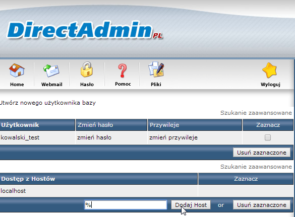 Z tak utworzoną bazą łączymy się w naszych skryptach na hostingu poprzez adres localhost.