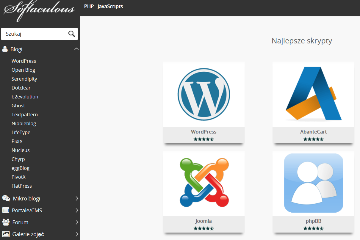 Następnie pojawi nam się lista dostępnych skryptów do instalacji, jest ich ponad 300. Najpopularniejsze znajdziemy na środku ekranu jako duże ikonki, pełna rozwijana lista jest po lewej stronie.