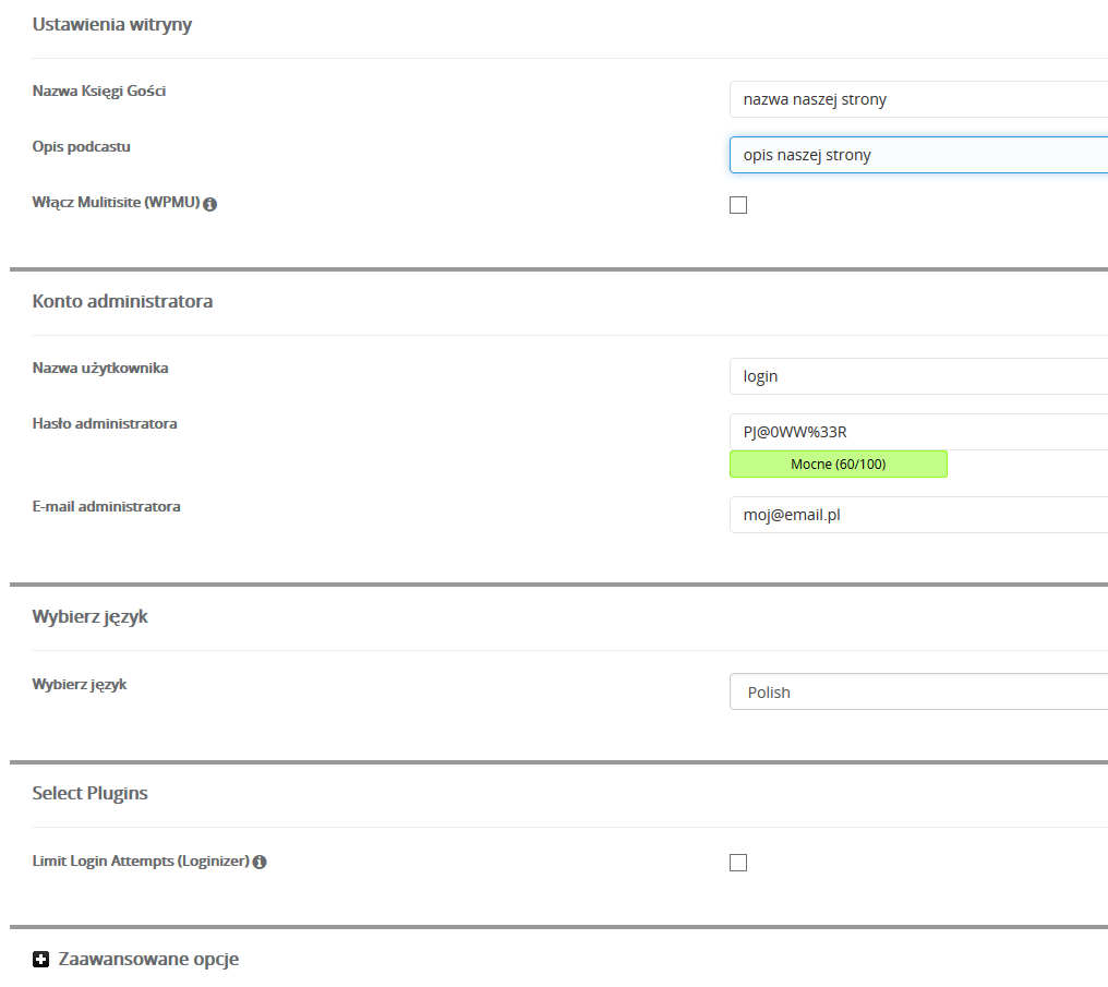 Następnie ustawiamy według poniższego screenshota nazwę strony, jej opis, login jaki chcemy mieć na stronie, nasz email oraz hasło, wybieramy język polski i zaznaczamy “Limit Login Attempts” aby dodatkowo zabezpieczyć Wordpressa przed botami które atakują strony.