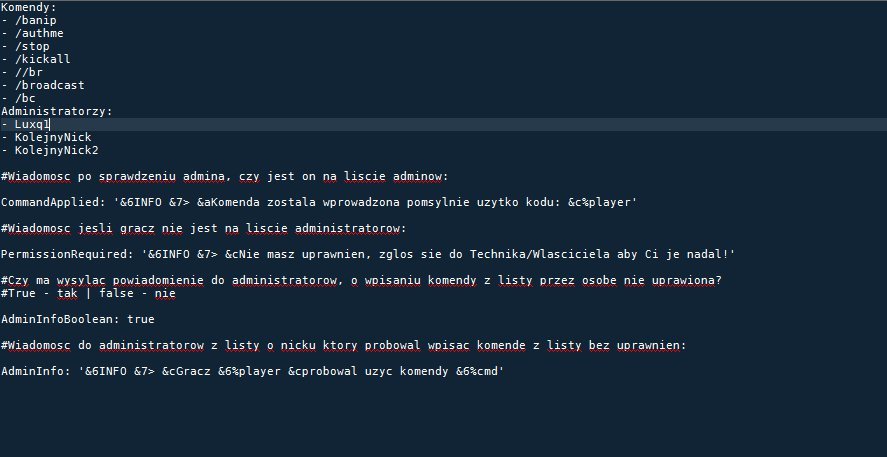 Plugin działa tak, dodajesz komendy do listy, które może użyć tylko osoba dodana w Linijce Administratorzy: