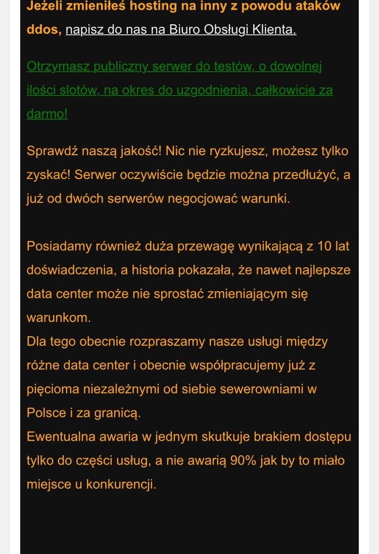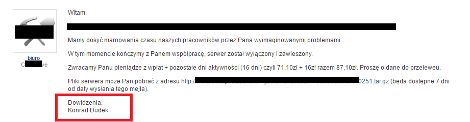 Teraz oczywiście nie będę mógł nikomu nic udowodnić bo zostałem zbanowany na Twoim jakże pięknym hostingu (a szkoda). Czy zbanowałeś mnie tylko dlatego, że niewygodnie było Ci odpisać na moje pytanie dotyczące Twoich usług lub przyjąć moją drobną sugestię dotyczącą niedziałających funkcji w panelu, nie zdążyłem zrobić wielu więcej zdjęć z naszych “niewygodnych” rozmów i pewnie już nie będę miał okazji… trudno.
