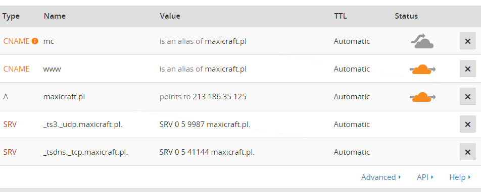 Same problemy ostatnio, i o ile część rozwiązuje sam to są takie, które nie dają za wygraną. Tym razem padło na domenę. Otóż nameservery u usługodawcy mam ustawione na te od CloudFlare. Tam mam dwa rekordy A - maxicraft.pl który jest połączony z moją maszyną i drugi www, który sprawia, że subomena www działa. Mam tez dwa rekordy SRV wskazujące na porty TS’a. I wszystko byłoby super bo wszystko co wymieniłem działa, ale nie działa połączenie poprzez domenę do serwera MC. Działa tylko IP, co dziwne bo jeszcze niedawno domena działała. Rzeczy które próbowałem:
