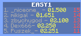 Wiemy, że wszyscy lubią rywalizację, a zdobywanie najlepszych czasów na arenach jest do tego znakomitą okazją. Dlatego na każdej arenie dostępny jest ranking graczy, którym przejście danej mapy zajęło najmniej czasu. Po przeteleportowaniu się na arenę nasz scoreboard wygląda tak: