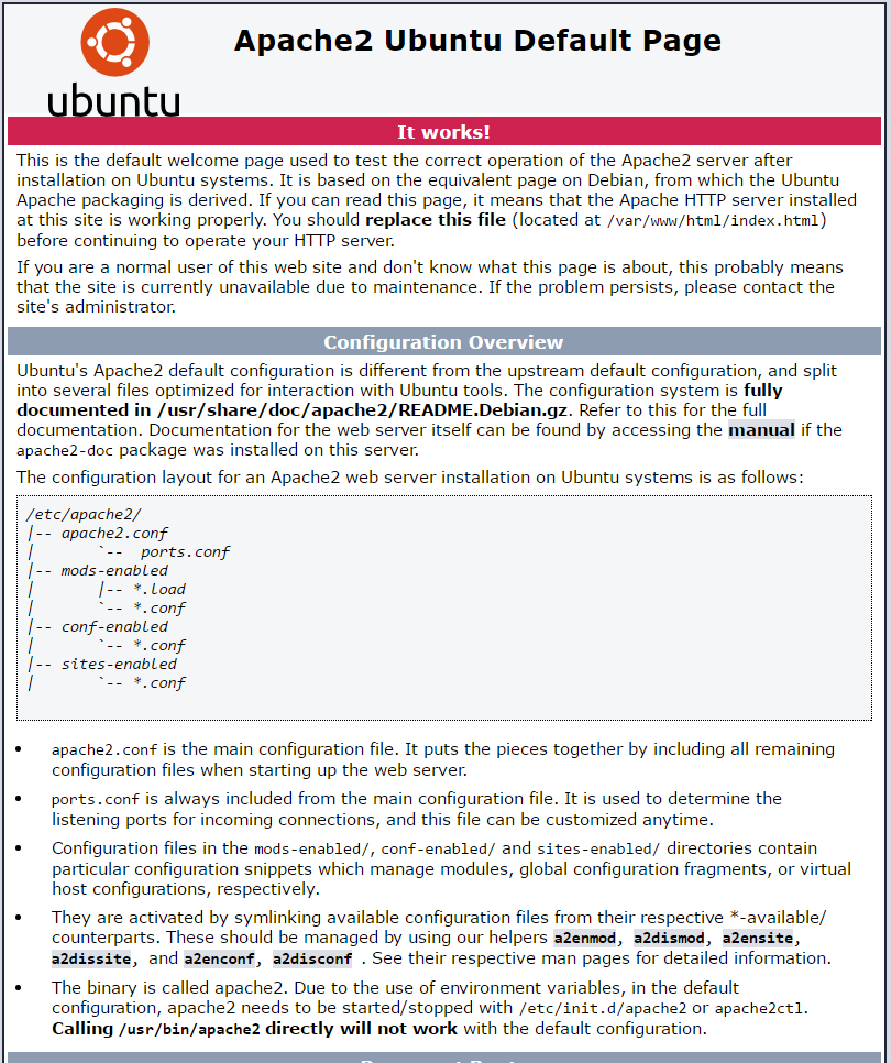 1. Aby przetestować serwer apache wystarczy wejść po przez przeglądarkę na IP naszego serwera. Jeśli otrzymamy taki wynik oznacza to, że apache2 funkcjonuje poprawnie: