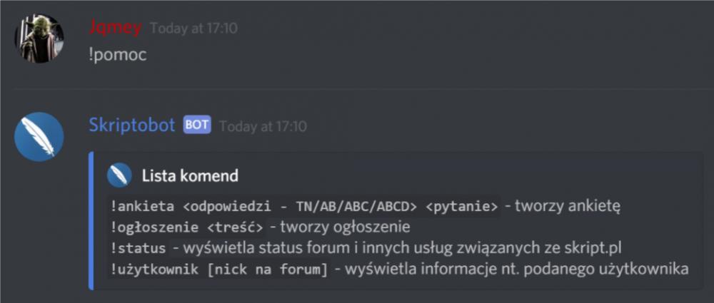 Na chwilę obecną posiada on 5 komend: !pomoc, !użytkownik, !status, !ogłoszenie i !ankieta.