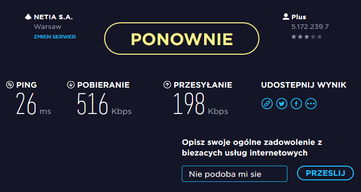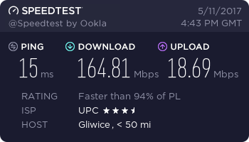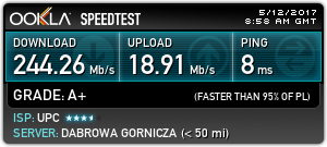 [img]/uploads/default/original/2X/5/56475bd611943c58b7e4a08649491777eff9cb98.png[/img] - ogółem nie polecam tego ISP / często wywala a za cenę 99,99 PLN można mieć min. 15mb/s uploadu i 80mb/s downloadu.