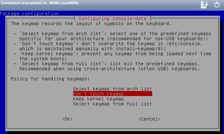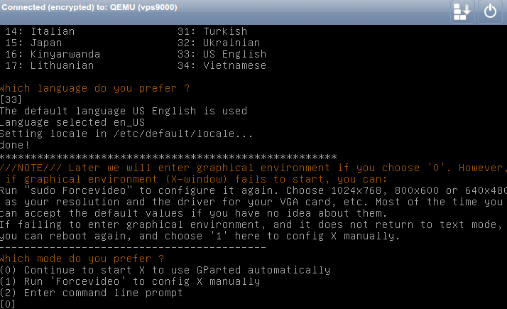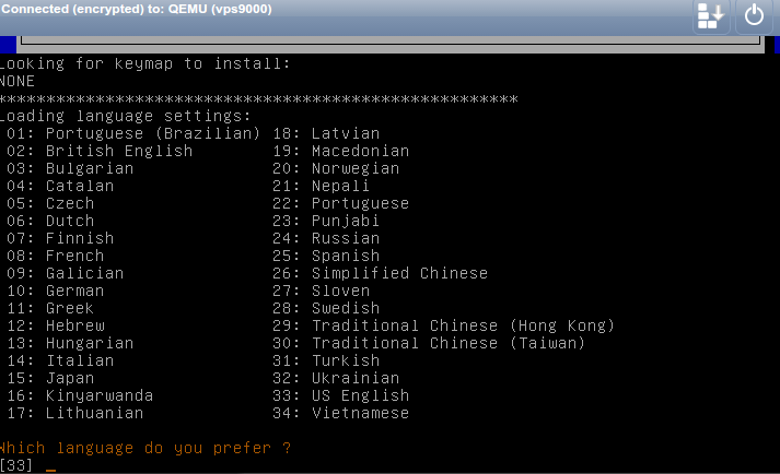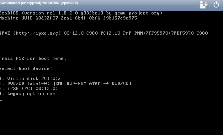 i w konsoli noVNC trzymamy F12 lub Esc tak aby pojawił się nam wybór urządzenia z którego chcemy wystartować VPS, w tym przypadku jest to pozycja 2.
