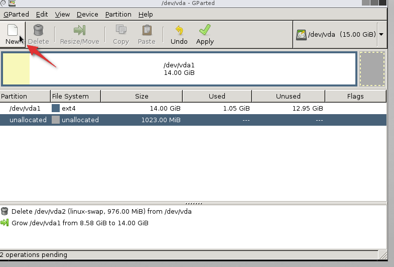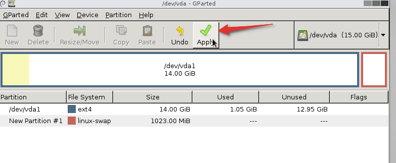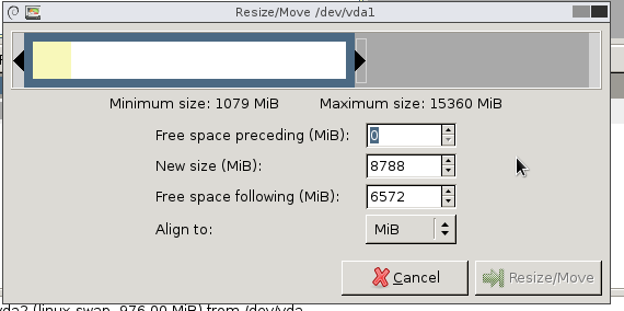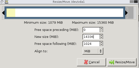 Widzimy że maksymalny rozmiar partycji jaki możemy ustawić to 15360 MiB, odliczamy od tego 1024 MiB na partycję swap co daje nam w tym przypadku 14336 MiB i tyle ustawiamy w New size