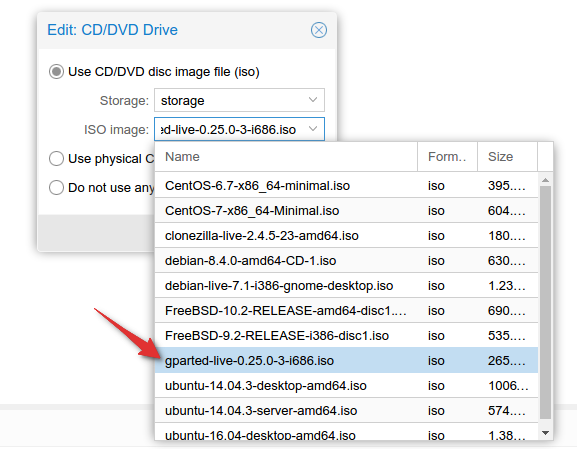 Wybieramy obraz GParted, jeśli nie ma go na liście to należy utworzyć zgłoszenie w panelu klienta z prośbą o jego dodanie.