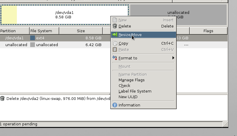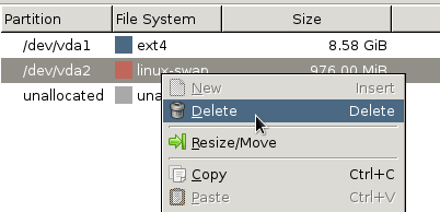 Usuwamy najpierw partycję swap gdyż nam przeszkadza w zwiększeniu naszej partycji z danymi.