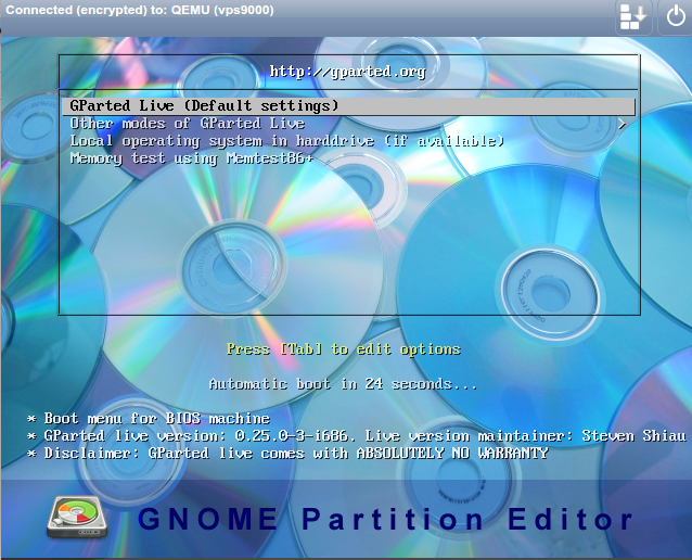 Pojawi nam się ekran startowy GParted live cd, wciskamy Enter