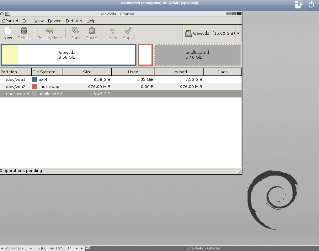 Pojawi nam się tryb graficzny z GParted, widzimy że 5.46GB jest nieużywane jako szary pasek, zmienimy to.
