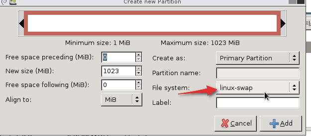 Teraz utworzymy nową partycję swap wybierając linux-swap