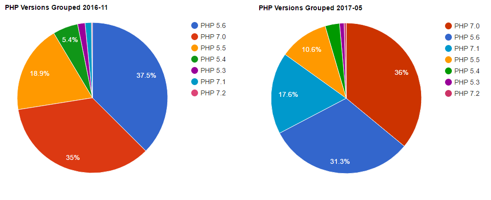 Źródło: https://seld.be/notes/php-versions-stats-2017-1-edition - blog twórcy Composera, oprogramowania do zarządzania projektami w PHP, więc ma bardzo fajną bazę do zbierania statystyk.