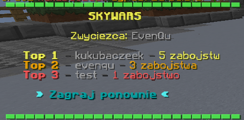 od kilku dni piszę system minigier, na pierwszy ogień wziąłem skywars. I tak trochę nie mam pomysłu na projekt scoreboarda. Akutalny tak średnio się prezentuje, ale zawiera te dane, które chcę ujrzeć na tym docelowym.