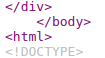 No i jak zobaczyłem taki kwiatek na końcu to już sądzę że nie muszę szukać dalej. Rozpoczęty na nowo tag i do tego jeszcze doctype na końcu (?) Wygląda to na brak elementarnej znajomości HTML twórcy, mimo że nie jest to nawet język programowania