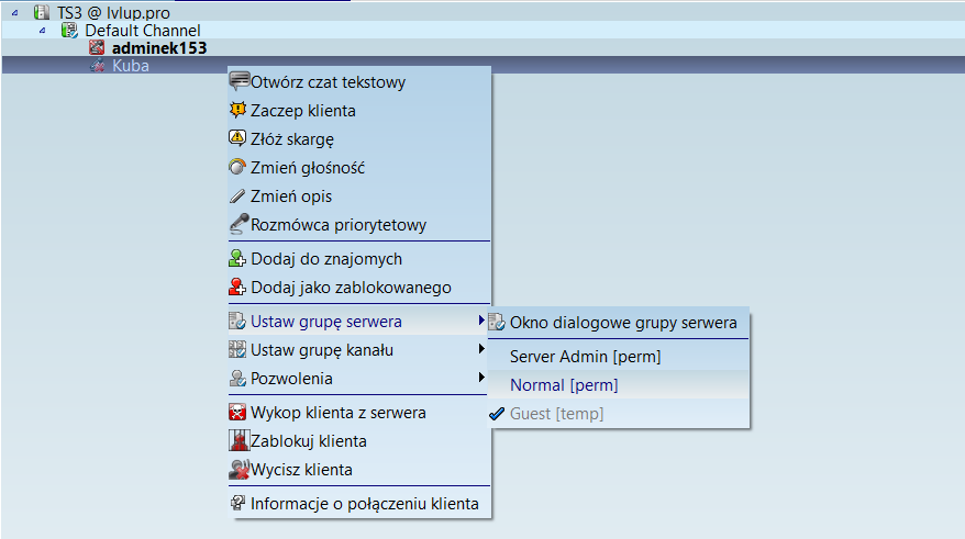 W ten sam sposób możemy ustawić użytkownikowi rangę na kanale, należy wybrać opcję Ustaw grupę kanału [ :flagus: Set Chanel Group ]