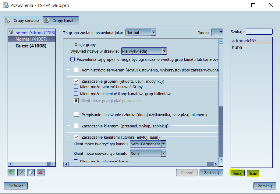 [ :flagus: Set Server Group ] i wysuwa nam się lista z dostępnymi grupami, które możemy dodać lub zabrać ów użytkownikowi.