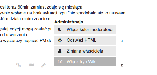 Wszystkie poradniki lub wątki wymagające częstej edycji mogą zostać przekształcone w tryb wiki co daje możliwość ciągłej edycji, również poza 60min od utworzenia.
