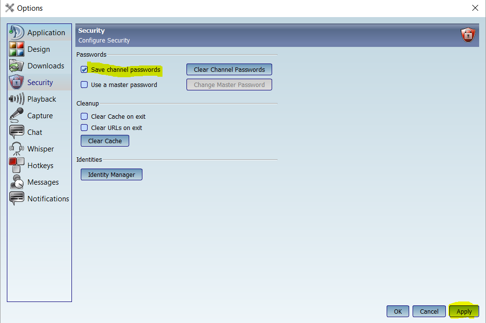 W drugim kroku musimy zaznaczyć pole zapisz hasła kanałów [ :flagus: save channel passwords]_ i potwierdzić.